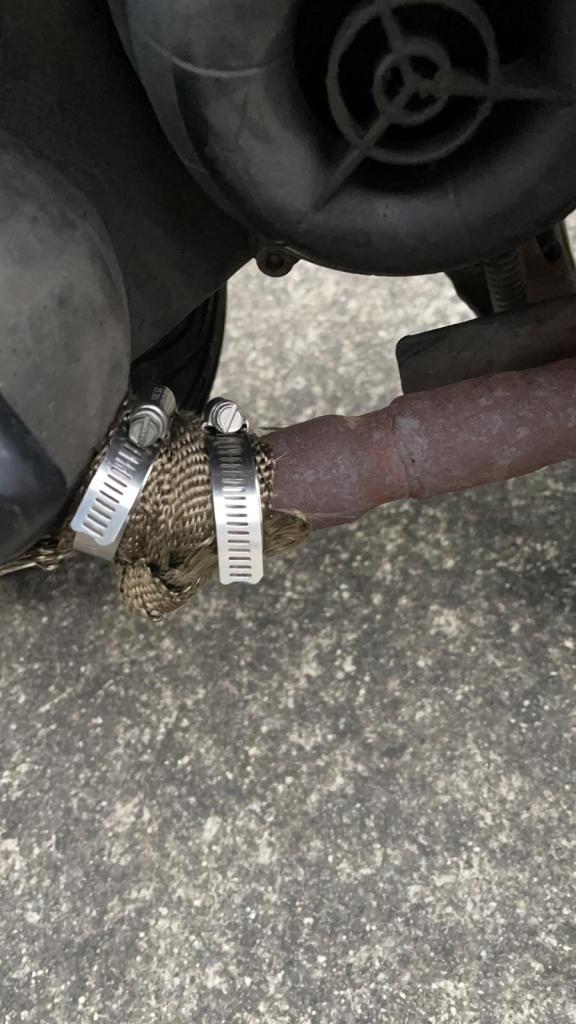 Well, my muffler on my scooter has been getting noisier and noisier, and I could quite work out what had caused it. I had a closer look at the muffler and it appears that there is a crack at the joint between the end part and the pipe that feeds to it. I bought some muffler tape (tested to withstand 2000°F) and I’ve sighted it up using some hose clamps – the net result is that it has been super smooth and super quiet. Long term I’m not sure what I’ll be doing but at the moment it is pretty sturdy: