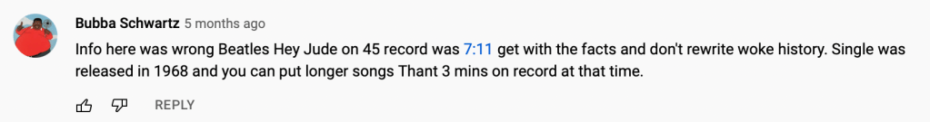 If you’re going to be arrogant in your correction while throwing in unrelated nonsense in your post (what this has to do with ‘woke’ is a mystery, it appears that certain individuals throw it around in much the same way that right wings throw around socialism or communism as a place holder for ‘all things bad’) then you might want to make sure that you get your facts right. The video never said you couldn’t have have a song longer than 3 mins on a 45 rpm record, the video stated that if you tried to squeeze more onto a 45 rpm record that the quality suffers because of the closeness of the grooves resulting in audio ‘lacking punch’. When it comes to how they might have made available Hey Jude on a 45 rpm record then it might have something to do with the specifications: