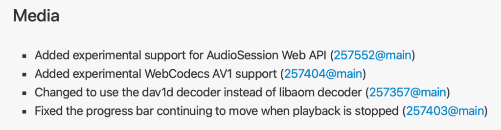 However interesting enough a few days later I went back to the Safari Technology Preview 161 blog notes and found that references to AV1 support has suddenly disappeared (the original page is available via the Google cache):
