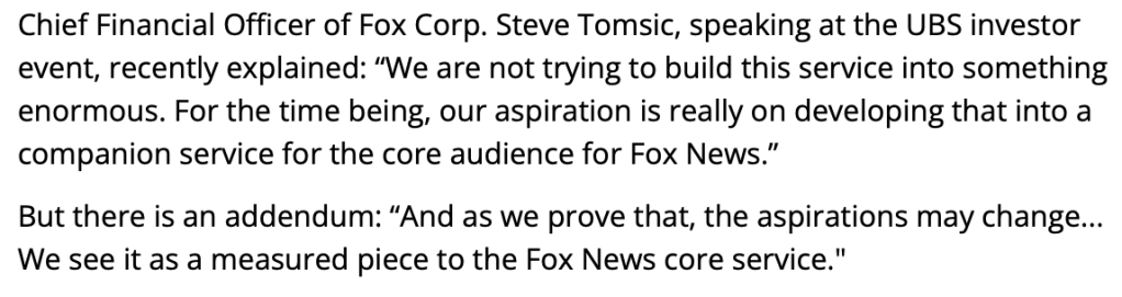 Side note: Although Fox News likes to boast about being number one cable channel but one thing to remember is that the media in the US is very fractured with Fox News as of 2022 having an average view ship size of 1.996 million – the average house hold size is 3.13 and a population of 331 million meaning that there are around 100 million households meaning Fox News gets around 2% of households watching their channel. When you break down the numbers it isn’t as impressive as the marketing make it out to be. That doesn’t even touch on the fact that the demographics are certainly not on their side with Fox News (their audience skews towards older demographics) along with not giving numbers on the number of subscribers using Fox Nation – their service that is apparently trying to win over Gen Y and Z. If their numbers were great then it would make sense that they would boast about it at almost every opportunity but from what it appears the fact that the only data has been guesses by analysts and the downplaying it as a ‘companion service’ (link) (I’m using a Google Cache link because the original website forces you to create an account):