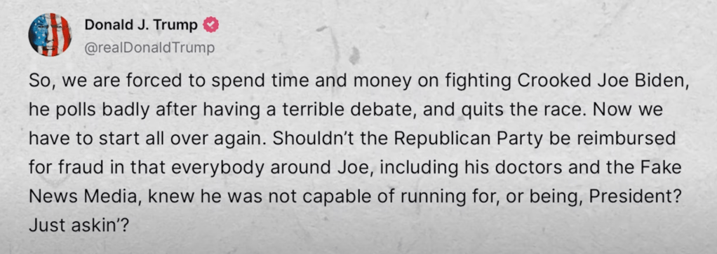 So it is the Democrats fault that you orientated all your messaging around a single person rather than policy? If you were smart you would have made your message something along the lines of “regardless of whether it is Joe Biden, Kamala Harris or anyone else, they’ll be all heading in the same direction which we believe is the wrong direction for America…” but then again that would require that the Republican Party isn’t run by the local brain trust. Once again Republicans playing the victim as they feel the consequences of the decisions they have made.